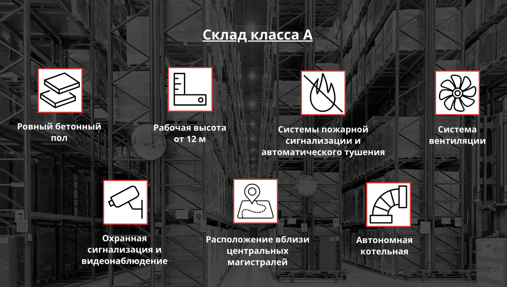 Складское здание построено с учетом требований, предъявляемых к складам класса А: рабочая высота — 12,6 м, подъемно-секционные ворота на каждые 500 кв. м складской площади. Над зоной погрузки склада предусмотрен офисно-складской мезонин. Во всех помещениях есть автоматическая система пожаротушения